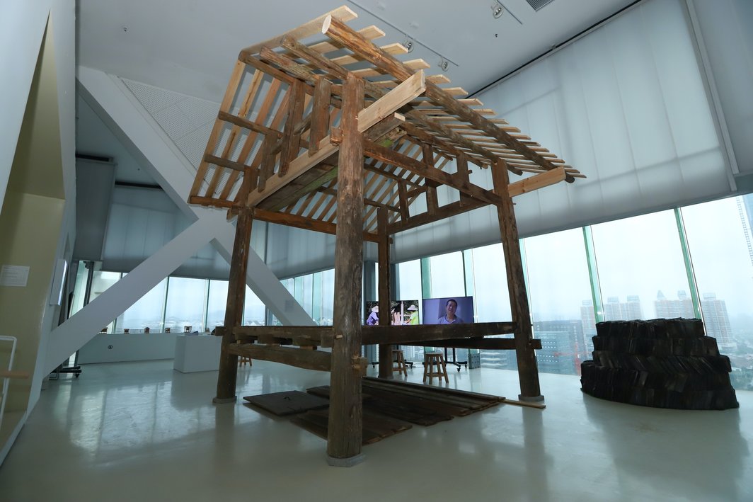 展览中尤其值得一提的是“無名营造社”围绕黔东南传统建筑制造的《地扪禾仓移筑事件》(2022),禾仓用于传统储粮的功用性已逐渐失去,这座禾仓以协商置换的方式从遥远的地扪村被移至美术馆,过程中由此卷入的各种难题,以及多方错位的身份与视角,使这座拔地于高楼的“禾仓”成为了一个悬置的起点,等待被更多讨论激活。立在此处,目光穿过“苗文翻译局”书写在玻璃上的文字,是远方的山群和与近处的施工地,而眼前无法被知识识别的语言、档案和竖立的苗族花杆,共同创造出了新的视觉记忆。河流产生联结,并天然抵御试图以暴力控制它的力量,它包裹复杂性,又将之转化为动能。即使无法过度乐观地想象基于这种动能的未来,但这个展签上没有国籍的展览给予了“可能性”的旅程,以河流串联起相似的境遇与经验,而非给出结论。我们当下的境况,或许已无法倚赖被动知识作为抗争,吞下展览提供的苗文饼干,却会期待在古老传说中学习到某种信念逝去后的希望叙事。