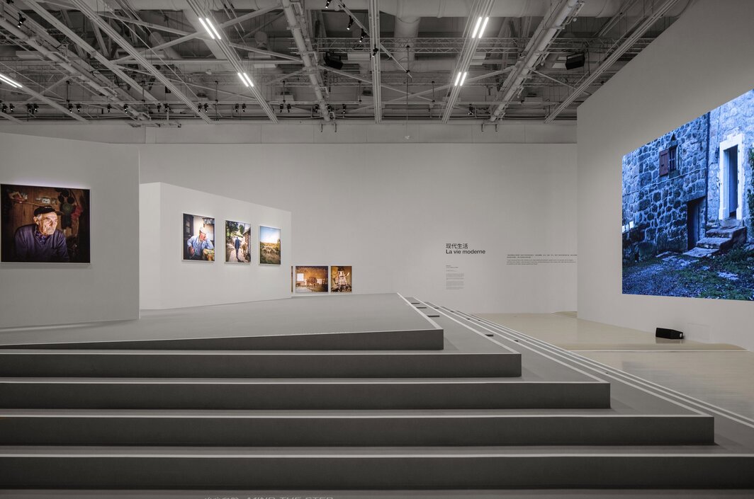 在上海当代艺术博物馆与卡地亚当代艺术基金会共同举办的德巴东个展“现代生活”中,展厅中央被设计成如山脉般隆起的样子,呼应山区农场的崎岖地形。不平整的土地不适合大规模的集约式农业,中部山区的农民仍旧保持着传统的农耕习惯,以及与土地密切相连的生活方式。展览标题取自“农民剪影”三部曲最后一部影片(也是本次展览主题电影)的题目,仿佛具有双重意涵:既带着些许反讽,暗指现代化进程中被遗落的区域里传统生活方式的消逝;又是一种反思,指出农民与土地和环境相契合协调的生活并非落后,反而具有某种别样的“现代性”。
