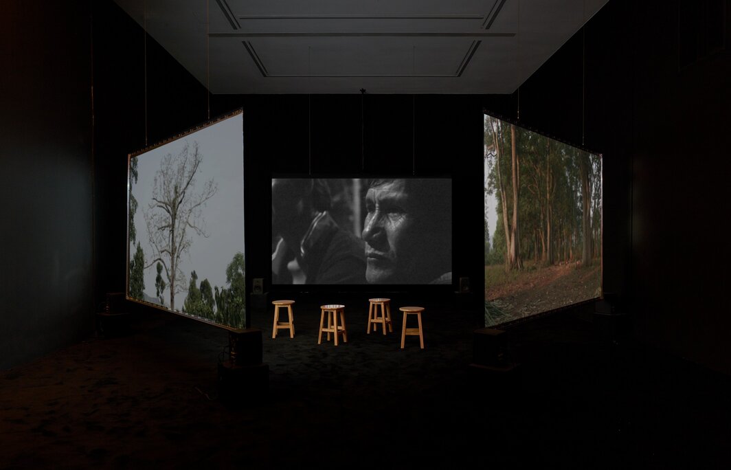 三频道影像《如何改善世界》(How to Improve the World,2020-2021)让人印象深刻的首先是观看时的身体体验:不同于此类影像的常规放置方法,三块幕布组合成等边三角形,将观看区域较为局促地围合起来。45分钟中,影像和声音在三边来回亮灭,观者的身体需要不断地回转侧身,有时必须站起来挪动凳子,以找到合适的观看角度。