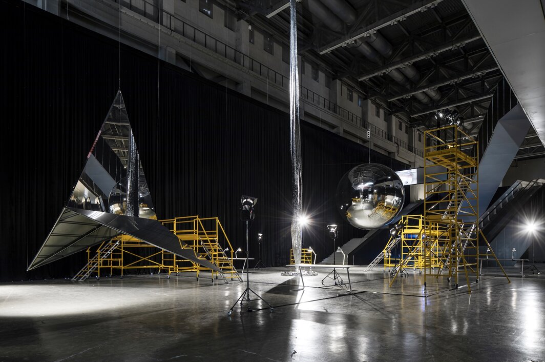 特雷弗·帕格伦,《非功能性卫星原型(设计4;建造4)》《轨道反射器(比例模型)》、《轨道反射器(三角形变体 #4)比例模型》在上海双年展的展览现场,2023. 艺术家及奥特曼·席格尔画廊(旧金山)、佩斯画廊惠允,上海当代艺术博物馆供图.