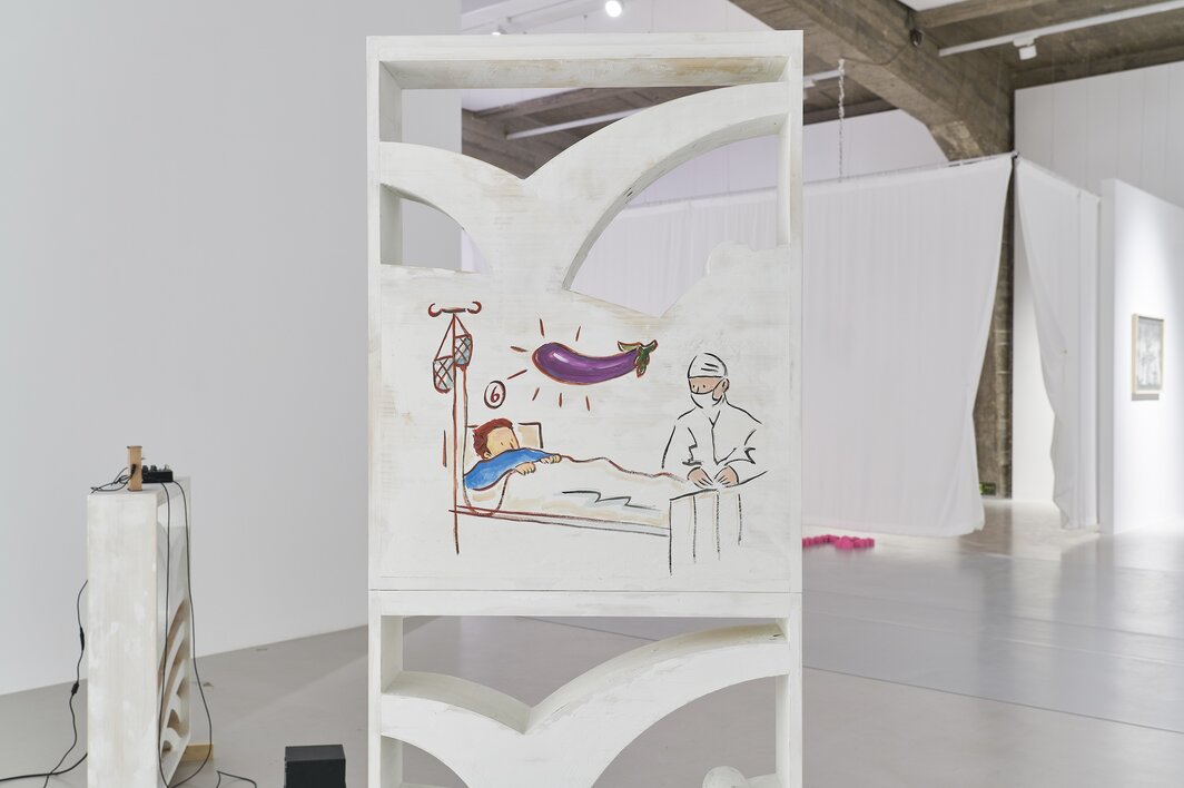 根据策展论述,传统市场和商店街里保留至今的民间仪式与Righteousness在神学上的含义彼此呼应。洁西·拉扎菲曼迪姆比(Jessy Razafimandimby)用旧床单、跳蚤市场淘来的灯罩、纺织物,以及绘画,营造了一个具有祭奠意味的感性场所,旧物的些许神秘感在引起猜测之余也加重了叙事的讳莫如深。另一边,徐喆的声音装置《经验建筑1》(2024)自成一隅,如独辟的休憩角落。涂上石膏的松木参照了八十年代的建筑范式,较高的方木背后画着一个躺在病床上的人,摆在低处的时钟滴答走着,清晰的声响似在为画中生命精确计时,故事的哀伤有待观众去察觉。