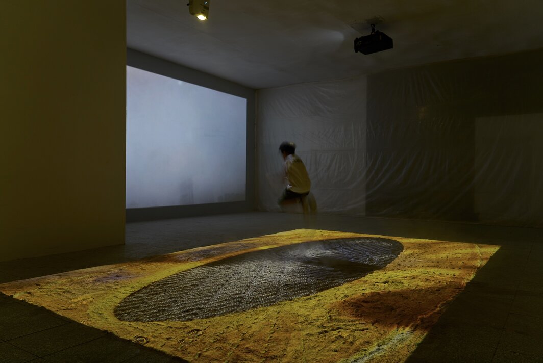 熊佳翔的个展“雨水与灰尘”在他位于草场地兴达应用技术研究所的几间工作室里展开,不同媒介的作品被分隔在四个展厅里,前后构成了相对独立的四幕。展览标题中的“灰尘”,直观地显现为第一间展厅地面上铺成长方形的大片灰土,这些灰土来自熊佳翔冬季取暖烧尽的木柴等物料。在这块特殊的“屏幕”上,投影播放着由月食、蹦床、装饰射灯等视频素材拼贴而成的动态影像。对应标题中的另一个意象“雨水”,《水滴》(2023)这件作品被设置在第四展厅,观众需要从小门侧身走入。在这里,四面墙完全被A4尺寸的白纸列阵覆盖,白纸上附着着商业广告拍摄中常用的仿真水滴。踱步其间,不免有身处隔音审讯室或汉白玉地宫的禁闭感。