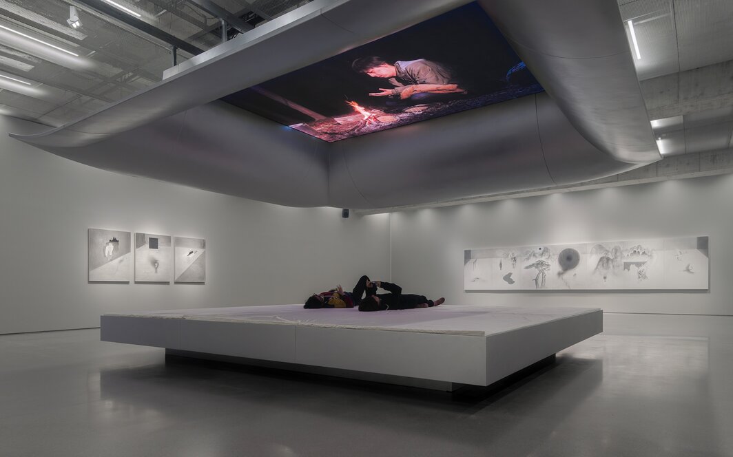 展览里唯一的一件影像作品《暴雨将至》(2024)被投影在悬浮于展厅中的“超然亭”内,观者需躺在亭中的白色布垫上仰望男女主角之间这场不仅在树林一隅,也在微信聊天界面上发生的交谈。男性人物是陷入数字昏睡(digital lethargy)、身心俱乏却又充满困惑的人类样本,他围绕身体性、虚构与真实等话题输出的大段信息是存在主义危机催生的又一诗意宣言;女性人物则以靡靡之音唱出源于南北朝志怪小说里的唱词,或是在微信上发出以蜿蜒线条为主的表情包去消解前者精心编辑的冗杂诉说。乍一看,这或是体验派与方法派间的再一次交手。但在所有的故事和对话之外,我的目光被微信键盘下方那未被选择但根据打字人的输入记忆法排出的带有意向性的语词们长久吸引,相比宏大叙事而言,它们是零散庸常的,如瓶身的碎痕般,爬满现代生活的每个角落,将死亡的召唤抵挡在意识门外。这般全然暴露的真实让自相矛盾的语法游戏不再苍白与遥远,它或许是艺术家悬置暴雨将至未至前的这段时空的用意所在,即在精神客体对疲惫不堪的主体进行全面裹挟时留有自我消解的余地。也正因如此,女性人物对图像和声音的轻盈运用并不是全然宣告了文字的枯竭,而是让男性人物的晦涩宣言有了新的可读性。