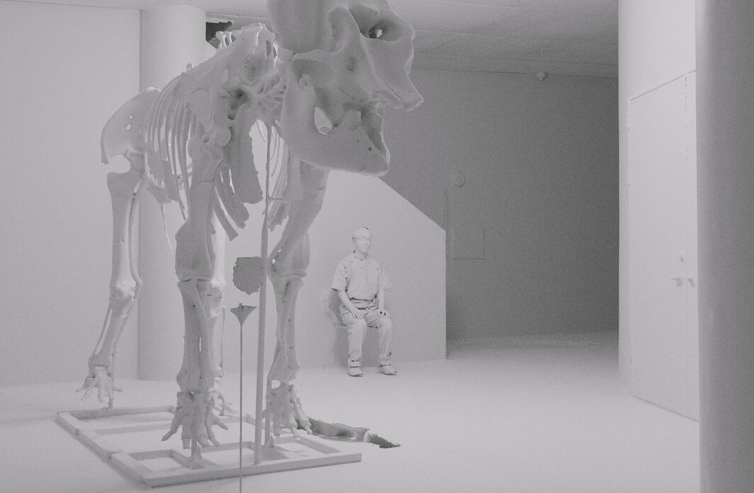 除此之外,《动物园假说》也值得一提。这部3D动画影像与前两部纪录片性质的作品在思路上极为近似。影像围绕着战争时期台北动物园的两件轶事展开。其一是为了纪念在战争中丧生的动物,驯兽师训练大象和猩猩模仿人类那般下跪哀悼同类;其二是1944年为防止美军轰炸城市导致动物逃逸伤人,动物园干脆先行处决动物并且就地制成标本。隐含在这两则荒诞故事背后的,恰似就是拉图尔所说的人与非人构成的行动者网络。只不过,在许哲瑜这里,行动者网络这种应然的共生关系,又何尝不是实然中互为灾变的相克关系呢?