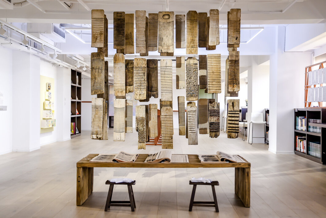 陶艾民,《女书》,2008,搓衣板、渔线、墨水、宣纸,“The Book as Artistic Medium”展览现场.