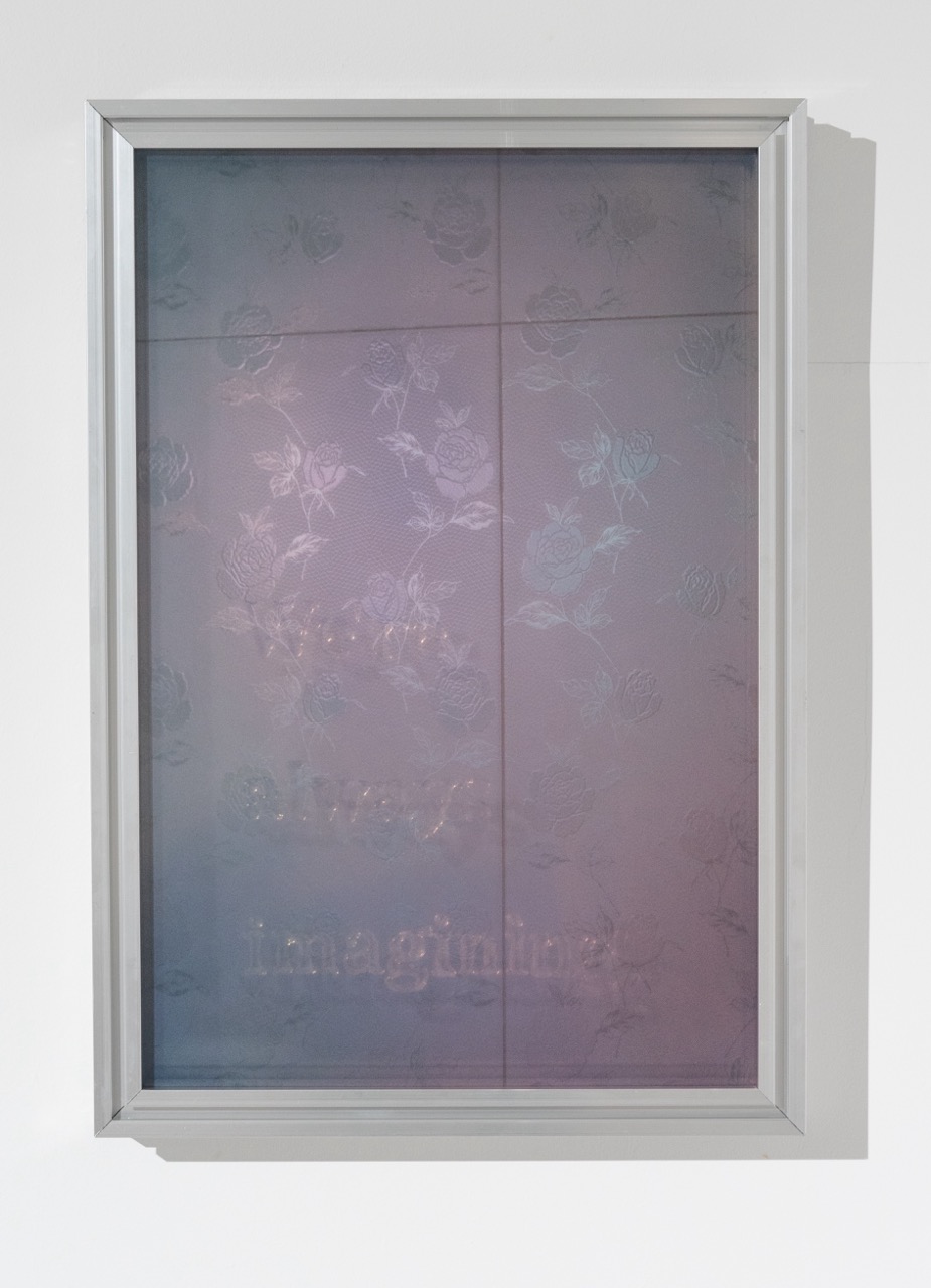 当观看作品《窗#1》(2025)时,人们的视线停留在从玫瑰花影间隐约浮现出来的一行字上:“We’re Always Imagining”(我们始终在想象)。这句短语引用自艺术家最初尝试的几则英文写作之一,是一个突如其来、没头没尾的发言,却透露出一种对图像无限增殖时代的集体无意识的觉察。我们无法停止想象——就像艺术家在《现世的琥珀》(2025)中试图用糖果色的树脂鱼钩串联起虚空,而有人会在重金求得的LABUBU上贴满水钻——我们无法停止想象并建构存在的意义,也不曾放弃借助仪式与耗费去寻求对生命之“无”的捕获。而这,或许正接近艺术的某种本来面目。