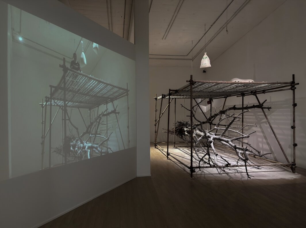 进入展厅,观众首先看到的是一棵枯树,它斜倒在双层脚手架的下方,枝桠伸向框架外,被绳子吊起的树根并未完全附着于地面。开幕当天,韩五洲站在脚手架上,戴着拳击手套不停击打天花板上垂下的三袋加起来与其身体等重的面粉,直至体能达到极限而停止。在此过程中,渗出的面粉渐次散落,如同粉雪飘落到下方参差的枯枝上。在持续一个月的展期内,观众看到的装置《桃花源》(2025)正是这场行为表演的结果。实施行为的拳击手套挂在手脚架一侧,墙上的录像透露着作品成型的端倪。艺术家在其摄影作品中经常使用的红色药片被零星粘在树枝间,乍看易被以为是隐现于枝头的红色花蕾或果实。视觉上的错觉隐喻了一场虚幻的期待:艺术家用肉身搏击降下的粮食为枯竭的生命提供了重生的养分,树在莹莹“白雪”中含苞待放。但这层“仿佛若有光”的期待,对于被铁架围困的无土之木而言,不过是仅停留于意象层面的微茫希望,令人欣然规往却寻觅未果的桃花源,只存留于向往与想象里。