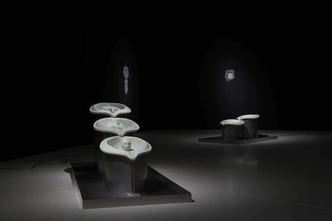 但如果你通过导览,戴上文字的眼镜,作品则呈现出更为复杂的现世面貌。长条幅垂帘由两列鸟类剪影组成,其图案源自一段关于乌鸦悲鸣的短视频静帧,以陶瓷烧制串联而成(《袅袅:悲声》,本文提到的作品均创作于2026年)。它同时具备了祭祀剪纸的简朴形式和摄影胶片所独有的时间绵延感,而陶片捏制和釉面上色留下的手工痕迹又将这两者奇妙地融合在一起。祭祀焚烧与烧陶都是基于“火”的人类活动,在此也呼应了鸟类与人类共享的情感震颤。题为《泪涟连:獾,牛与人》的三个淡绿色、眼睛形状的水池由高至低相连,池中分别安置着一只獾、两头牛和一具人类头像。清水层层跌落,从每个生物的眼中流淌出来,漫出水池,并在内置水泵带动下无限循环。该作品借用了流行病传播学中关于病原体跨物种存续的“蓄水池”概念,以此暗示物种间的健康边界其实相当脆弱与模糊——几年前那场令全球人员和物质流动陷入停滞的Covid-19疫情已为此提供了切身的佐证。“浮标”系列将人类与海洋的共生意象像铭文般刻画在海上浮标造型的陶瓷雕塑上,在蓝绿紫褐的深邃釉色覆盖下,珊瑚、鱼以及各类底栖生物和一幅深海石油采掘设施的图式毫不违和地并置在一起。