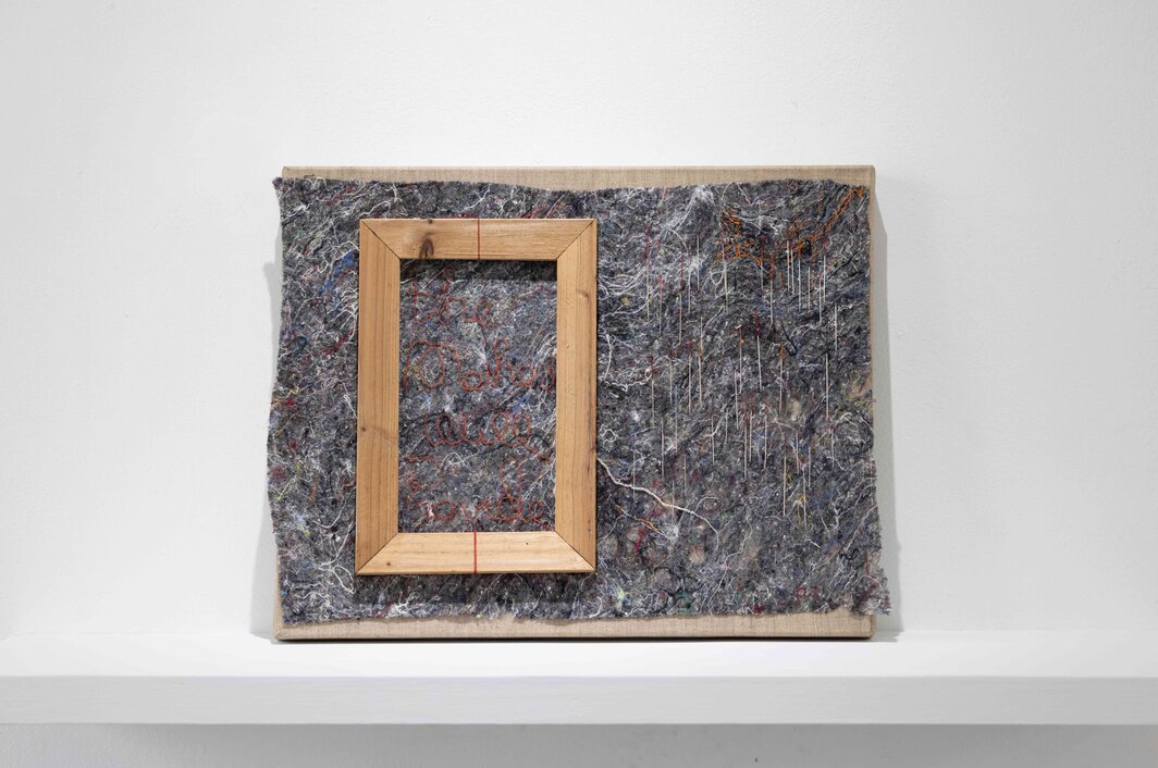 在展览同名作品《忍冬花语:妈妈会来帮忙的》(2026)中,针线缝制的弯曲字体似乎从形式上呼应着忍冬蜿蜒的藤蔓。艺术家将自己想象成母亲手中的“缝衣针”。这些既是工具、又象征韧性与穿透力的物体,被悬挂在用相框定格的箴言——“The Mother Will Provide”旁。灰色毛毡上隐现的针线,既是母亲塑造女儿的工具,也是女儿刺穿母亲期待的刺。忍冬花将蜕变的过程凝固,而这对母女则在针线的往复中完成了一场无声的权力交接:母亲传递的是缝补的技能,女儿学到的却是如何缝制自己的轮廓。