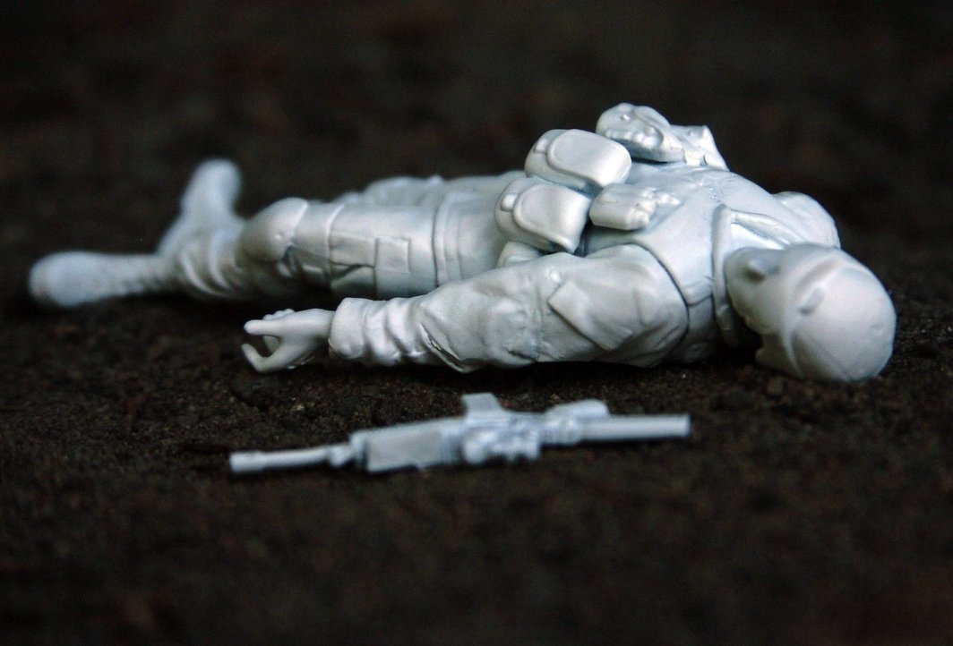 德拉(Joseph DeLappe)的这次艺术项目早在5年前便开始实施了,他选用的素材是美国军方为了征兵的需要而赞助开发的一款第一角色扮演射击类网络游戏《荣誉勋章》(Medal of Honor Breakthrough)。艺术家首先注册了一个作战人物,然后将自己进入游戏中以第一人称行走的镜头保留下来做成了一段影像。游戏中的艺术家并没有射击,因此很快被敌人——塔利班武装分子——击毙在地,于是他将这个形象截取下来,在纸上对其进行了如实的描绘,并用固体材料仿照这个倒下的战士做了一个只有二十多厘米高的雕刻放在小型的台面上展出。德拉遂而用相机拍摄了这件雕刻,并将照片放大了很多,给人造成了一种庞然大物的错觉。在展厅的中央,他用一种特殊的白色有机材料将游戏中一名塔利班武装人员端枪和射击的手分别做了截取和实体还原,而且他还特意用大小不同的几何面进行塑造,仿佛是在游戏设计过程中的建模这一环节的物理性实现。