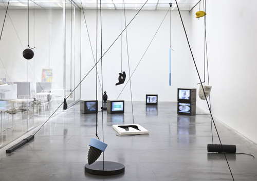 在艾瑞卡•沃特(Erika Vogt)首个博物馆个展入口,从天花板上危险地垂下了一只锚状的黑色石膏模型。这是一种交换的先言者,预示着整个展览中这种无形而又神秘的交易。特别是在其他的参观者可以穿梭其中的十一个或是被拣到的、或是些被制造出的悬挂的物体间。入口的锚由一条连接着上方滑轮的绳索垂下,并且悬挂在空中,因为这条绳索同时被地上形状不明的石膏模型作为平衡物固定住。这种效果更容易产生物体间拉力和错觉,而在沃特的作品以及她制造出的浮动场中,却有一种流动性与妥协性充斥其中。从某种程度上来说,她的装置《陌生碎片滚滚滚》(Stranger Debris Roll Roll Roll, 2013),使人回想起弗莱德•桑贝克(Fred Sandback)的一个作品中描绘和分解空间的直立又紧绷的线条,只不过在这里,这些线条能够舒展并屈服于空间内无止的变化。