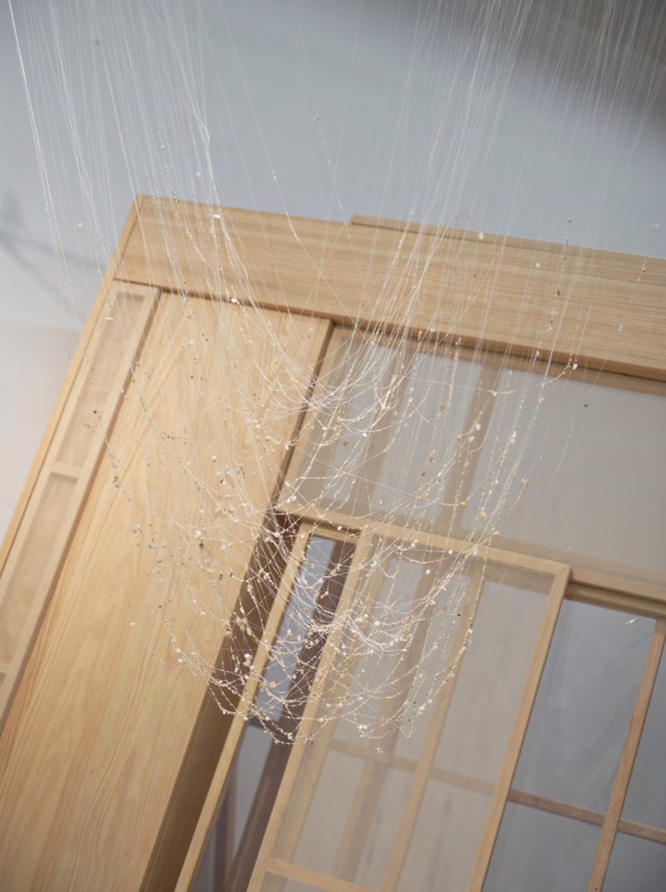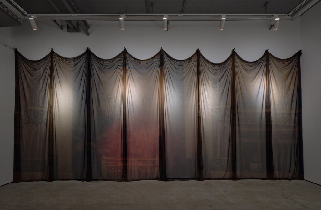 奥利维亚·贾1994年生于美国芝加哥的一个华裔家庭。源自惠斯勒同名系列风景画的展览标题“夜曲”显示了她探寻自我身份时的方法,即:将记忆、想象与现实融为一体,在私密的画面里构建能唤起共鸣的心理空间。在展览中的唯一一幅自画像作品《自画像与桑叶》(2025)中,艺术家用桑叶遮住部分侧脸,而图中的桑叶并不是在中国常见的、可入药的白桑叶(Morus alba),而是在北美更为常见的红桑叶(Morus rubra),就好像人与植物并无二致,离散的人会在另一种风土中生长,同时也保存着来时的身份印记。因此,不妨说奥利维亚·贾的画作都是某种意义上的自画像,如同镜厅般在画中画里映射出她探寻历史记忆(从家族记忆到集体记忆)及个体身份时的各种复杂面向。