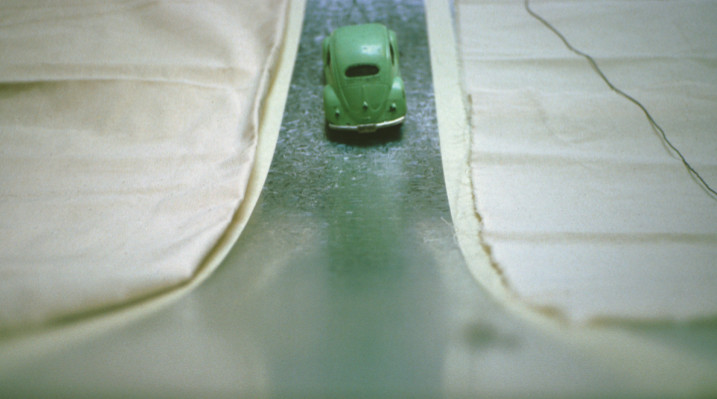 例如,录像《模型》, 1999就是关于《排演I》中西西弗斯式戏剧场景的习作,材料是一辆玩具大众车与纺织物和纸做的山坡模型。除了考察设计方案中的物理过程,《模型》还测试了汽车前进/上升和后退/下降的运动如何配合背景音乐(一个男人和一个女人合唱的拉丁歌曲)的起止。《模型》是作为“作品”参展的(有正式的作品标签),但却和资料展品放在一起,这一点说明它的地位具有某种暧昧性。虽然后来的完成日期和更大规模的《排演I》可能会让它看起来像是最成功最完整的成果(矛盾的是,它表现的是努力想要成功却最终失败的过程),但资料档案里的笔记和草图、《模型》以及《排演I》同时对这个项目的重复表现突出强调了在Alÿs的创作实践中,看似是最终成品的东西很可能只是一个瞬间或一个镜头,从而破坏了对艺术家制作过程的那种单向渐进式的解读。Alÿs的作品反对循序渐进的线性逻辑和按序排号的沉闷无趣,也不同于其他的重复回归模式 ——如弗洛伊德对小孩儿的“Fort-da”游戏以及诡异回想的理论阐释——他提出了排练的循环重复,作为一种反模式,帮助人们想象制作的状态和暂时性。这个反模式构建了展览本身:展出作品首尾呼应,观众仿佛进入了一个圆圈,就像动画作品《鲁皮塔之歌》,1998里在两个玻璃杯之间倒来倒去的水或者《狗和球》,1999中永远在接球衔球的狗。