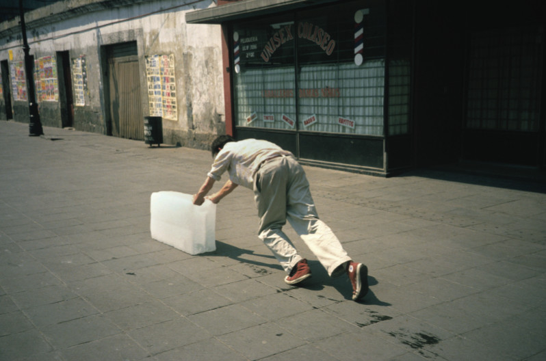 在著名的《实践的悖论》,1997里,Alÿs亲自完成了一项同样徒劳的工作,这件作品在本次展览中以五分钟的录像形式展出。录像分段记录了艺术家推着又大又重的冰块在墨西哥城的街道穿行九个小时的全过程。一开始,艺术家必须弓着腰拼尽全力才能推动硕大的冰块。后来冰块慢慢融化,体积缩小到只有砖头那么大,接着是方块,然后是鹅卵石大小,这时Alÿs操作起来就方便许多,他像做游戏似的踢着冰块在大街小巷游来荡去,直到冰块完全融化,变成人行道旁一片可怜的小水滩。因此,艺术家一天的劳动最终没有取得任何成果,除了对他“浪费的”时间和精力的记录(但因为这是一个艺术家的“生产”活动,所以就算他什么都没得到也算赢得了胜利,反之亦然)。这种表面上徒劳无益的努力在Alÿs另一件广为人知的作品《信仰移山》,2002里表现得更加宏大壮观。五百名志愿者在秘鲁利马郊外的一个巨大的沙丘上手执铁铲站成一排。他们的任务就是把这座直径一千五百英尺的沙丘往旁边移动两英寸。作为隐喻,《信仰移山》指涉了“发达”超级大国,尤其是美国,如何利用经济社会进步的空头承诺无休无止地戏弄“不发达”的拉美国家,从而明白无误地将Alÿs在无收效的努力,失败的力量以及排练上进行的尝试转移到地缘政治的语域当中。但这一活动排练的又是什么呢——剥削的危机还是即将到来的革命?