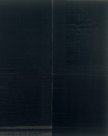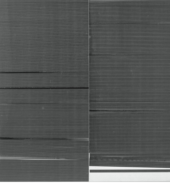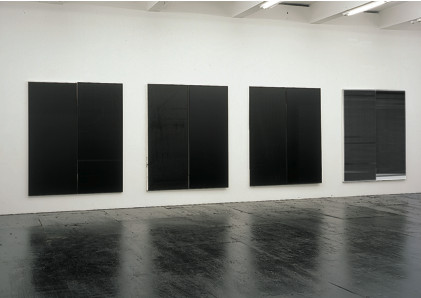 一旦画被放进机器里过一遍以后,它就会很随意地落到了地上,在划痕、弯折、灰尘上相应产生出时间的迹象。结果,长方形的两面——如果简单对折和临时捆扎这些过程不精确的话——最终很难完全对齐;甚至是,一面很容易比另一面略微高点或低点。一面,或者两面,在最后对齐之前,也许还会留下在打印机里穿过时,偏离机器的斜线;有时候也会产生一种屏蔽的效果,在大量的线条中,无意为之的光的意像近乎逼真,而这些线条也不再能够形成一个不受干扰的物体。试图承受更大更厚颜料的墨汁,也不时地混合,弄脏,滴落。每一片亚麻布打开后,中间都会出现对折的痕迹,这痕迹也并不太像垂直中央的一个“拉链”,如此,每幅画就出现了创作过程的痕迹——这一系列重复中真正连续的东西(或者至少说,唯一的很容易辨别的特征:当然还有数码“渊源”,这是所有单色画的基础--在基顿的电脑里,保存的是图片文件,有着最硬最夸张的名字——大黑.tif,搞笑的是,打开一看,却是未料到的几乎不着黑色的长方形)。这些做法导致的不搀假的视觉快感通常和它的具有观感的抽象表达联系在一起。在面对这些作品时候,我们不禁有扮演行家的冲动,希望对这些作品追根溯源,墙上挂着少的可怜的几幅画,它们作品呈现出一种苍凉的优雅,在形态的相似上,我们找到一条一脉相承的线。罗斯科,Reinhardt, Stella, Marden,这些名字跃入脑海。但请别忘记,这些只是表面上的单色画而已。它们并不是真正的单色画,因为他们的成功很大程度上在于其创作单色画的姿态,而实则并未达到真正理想的程度。最美丽的油画中的一部分,也是最为极简化的,如线一般粗细的线条彼此之间间隔将近一英尺。人们以为,是墨水筒的逐渐干涸才导致这样的结果的,但它们并非如此生成,问题并不是墨汁太少,而是太多了,当机器一遍遍执行基顿的命令时,它已经超负荷运转了。几乎所有的喷墨印刷头被已经形成和凝滞的墨阻塞了,打印机很难打出它被强制要求所应该打印出来的画面。所产生的这种微妙复杂的特性证明了爱普森打印机的自我清洁功能在需要它启动的时候,却根本不管什么用。