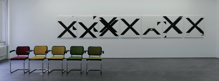 X的作品,与那些非常学院派的作品一道,做为艺术作品可懂性的的必要条件,试图令其变得清晰可见。 这也是他的作品不仅出现在博物馆和画廊中,而且还摆出一副做为绘画姿态的原因。对于他的作品,我们可能会这样问:怎么可以将其看成一幅画呢?又是什么能将其看成做为一幅画的画呢?在这种表现情势下,绘画走向了何种尽头呢?