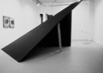 在过去的六个月里,基顿举行了两场个人展,第一场是在纽约 Friedrich Petzel画廊,另一场是在巴黎的Chantal Crousel 画廊。基顿为每一场展览都创作了独特的作品,乍一看上去,人们感觉他呈现在眼前的,似乎是碳素作品。在两场展览中,艺术家放置了由横木做成的板块,上面涂上了很浓的黑色,这种黑似乎很快就能反射和吸光。墙上挂着大幅的画,两场几乎差不多的发布会上,将其描述为“表面上(Ostensibly)为黑色的单色画”。 Ostensibly是个有意思的词,从某方面它强调的正是基顿作品的特点。这个词来自拉丁语中的 ostensus一词,意为“展现”,但言外之意是带有一些怀疑论色彩的。有些东西被表现出来了,但是有些东西并没有展现出来,有些东西被屏蔽了是看不见的。它的同义词是allegedly (据称,据说),而Ostensibly也暗示着,已经下了某种断言,某种声明,但是并没有可核实的证据去支持它。因此,表面上意味着看起来、听起来、感觉上是它所要说的那个意思,但却不时地跳出质疑,对我们所相信的产生疑问,并且进行质问。