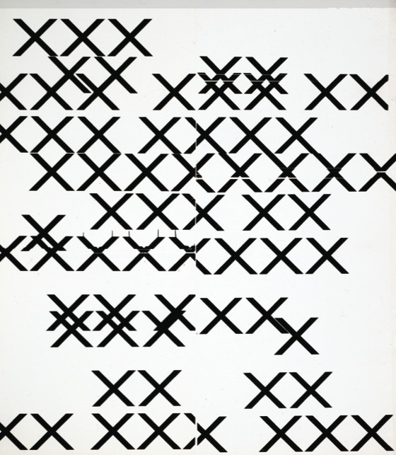 2002年的一天,基顿在他从杂志上撕下的书页上,打上了一个巨大的X,这比平时要更加小心翼翼了。他运用一把尺子,这些线条多少就变得笔直起来,但是,墨汁的不均匀,又使得X看起来更像是手绘的,也没那么无动于衷,这和他所期望的还是有些出入的。只要一想到这些画看起来是那么得麻木呆板,就可以想像得出制作过程得花多长时间了。从一堆杂志里撕扯出一页来,然后放到家用打印机里,设置成非常夸张的尺寸,将一个巨大的字母X打印到Word文档里去。