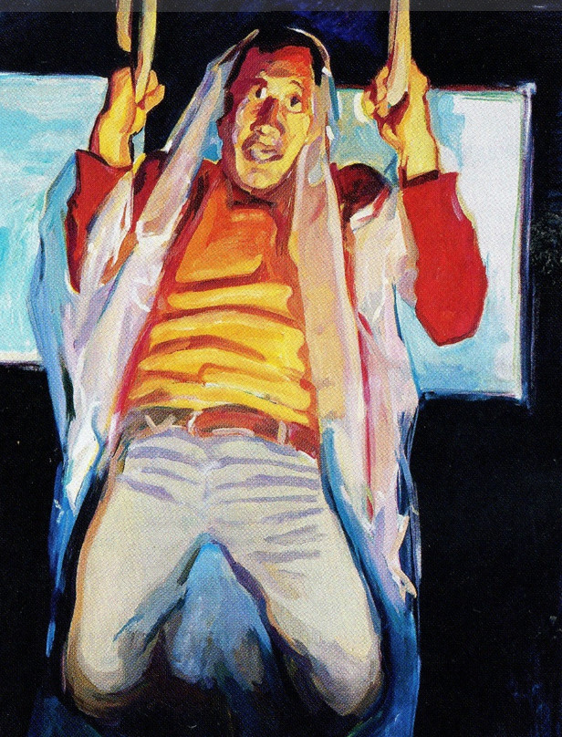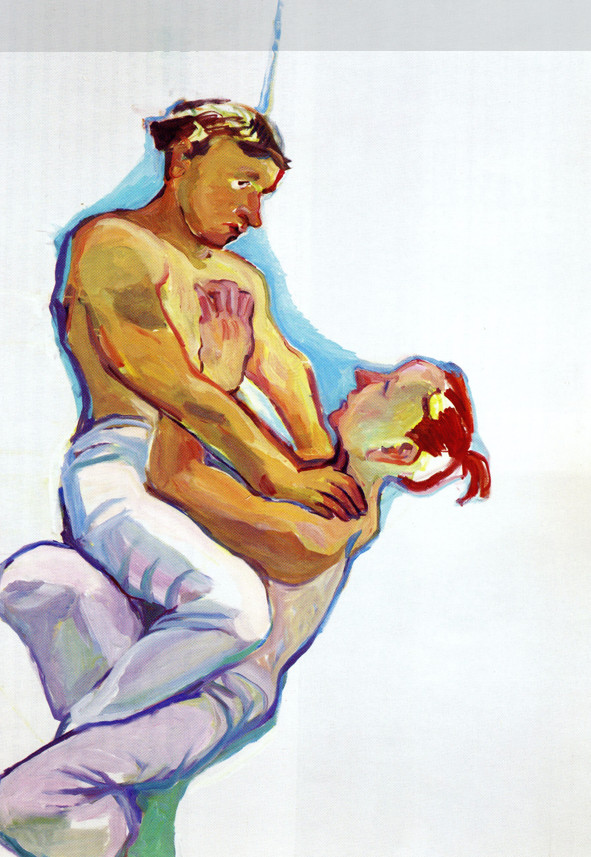 展览也包括一些我称为“激烈画”的作品。1999年,关于这些作品,我这样写道:“激烈是一种简化——是对于我们所厌倦再次看到的一切的生猛概括。”这种激烈也和一点夸张融合在一起。是纯粹的现实主义,有点美化和丑化。2005年的《体育是责任》中,就是这样的作品。当然,体育还是具有理性的意义在其中的,对我们的生存而言,但对我来说,对那个挂在绳上的模特来说,体育更是一个任务,而非学校的娱乐活动。在另外一个作品中,2005年的《你或我》里面,在一开始,动作就有了绝望的意味。我画我自己,画得好像一个拿了手枪的黄柠檬一样。图本身就很黄,再复制更黄,有些像凡高的黄。老年并不是我创作的真正主题,从哪方面讲都不是,这个画讲述的是死亡,是我经常面临的问题。我的一个朋友在他去世前给我电话,说:“不久后我要上天堂了。”有意思的是,人们总以为自己可以向上走,升天,事实是,在现实中他们是向下走,落到地上的。