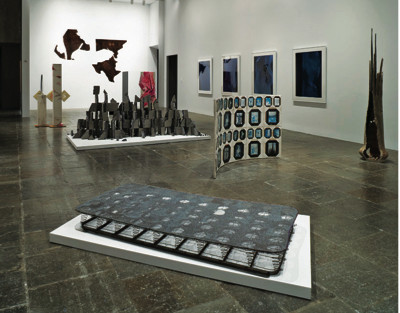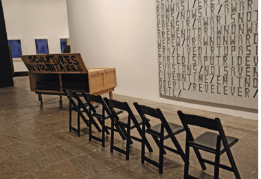 然而,把这种模糊性表现得最明显的是Shannon Ebner的STRIKE(2008)——由许多小幅黑白照片组成的方阵,每张照片上照的都是用混凝土水泥块拼成的一个大写字母。所有照片合在一起形成一个晦涩难懂的文本:no/it can/as it is/it is a war/raw as it is/it is an action/no/it is an opposition等。“no”相当于切分音,每隔几行就有一段回文出现;让人觉得似乎有章可循,但文字的递归模式又太过复杂,想找出实际规律几乎不可能。STRIKE旁边是《无意识雕塑》(2006)——一个木箱,箱内装着很多写着字母的大厚纸板(艺术家曾经把这些纸板拍成照片,用于创作2002——2006年间的作品《死去的民主之书》,但这些照片并出现在这次展览上)。两件作品加在一起就像一则寓言:首尾相扣的装配艺术,刚好回到已故策展人William Seitz于该门类诞生之初发现的语言操作规则上。1961年,William Seitz在MoMA策划了展览“装配艺术”——也是“非纪念性”艺术策展人的一个重要参照点——并在展览画册中提出,装配雕塑是斯特芳·马拉美(Stephane Mallarme)和纪尧姆·阿波利奈尔(Guillaume Apollinaire)诗歌的后裔。换句话说,装配艺术将两人系统化的混乱语言转换为物质形式——现成物和废旧品延续了荒诞重组的逻辑,艺术品变成了无数块“吮吸石”。 Seitz在论证中,神奇地从马拉美的实验诗歌《掷骰子》(Un Coup de dés)引申到劳申伯格的“集景艺术”(Combines),过渡过程平滑得让人觉得不可思议,因此很多人批评他的观点抽离了历史,毫无希望可言。但他从模糊诗学的角度解读装配艺术的做法在今天看来还是能够引起人们共鸣的。