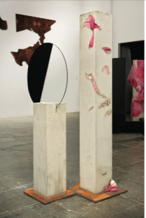 澄清“不足”概念的任务大都落在散见于美术馆各处的装置和走装配路线、摇摇欲坠的雕塑上。与后者同类的作品也大量出现在新当代艺术博物馆(New Museum)最近的展览“非关恢弘:21世纪的物品”(Unmonumental: The Object in the 21st Century)上,引发了人们对两场展览的诸多比较。非纪念性,反纪念性,我们还是把所有这些都放到一边——“所有这些”在这里指的就是雕塑。Laura Hoptman(跟Richard Flood和 Massimiliano Gioni共同策划了新博物馆的展览)反对把这一类当代艺术生产模式视为“关于艺术的艺术”( art about art)。的确,如此解读可能会突出放大这类作品中最无趣的一面,即它对二十世纪前辈的暗示和指涉。但该说法也反射回到了关于二十一世纪艺术品地位的讨论,这一点从“非纪念性”和“反纪念性”等描述词上便可窥见一斑。不管前缀是什么,这些词都通向水平状态(horizontality),堕落(abjection),无形式(l’informe)。二十世纪“无形式”和抽象纪念碑性质的反对声音如今已进入艺术正典,而以上词汇所代表的艺术就将这种主流化的反叛刻画成为一套焦虑不安的辩证法——越过深渊凝视纺织废品的领地,同时努力保持一种脆弱精准的形式上的统一。而此类作品还有另外一条轴线:一种同样细微的平衡关系,一端是此时此地——为艺术提供现成物或制成品等组成部件的文化环境,帮助作品在一种典型的拟人化规模下与观众见面的画廊实体空间,另一端是作品内在诗学的神秘属性。双年展上的某些雕塑向我们展示了这种平衡的迷人之处:例如,Charles Long瘦高细长的生物形态雕塑(用混凝纸浆与河流沉积物制作而成),看上去就像用湿纸团做的贾科梅蒂作品;或Patrick Hill脏兮兮的混凝土基座和玻璃钢平面,其中小块斑驳的粉色材料给整件作品精简的形式主义气质注入了些许波澜。