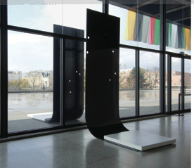 展览中,在创作指涉上,最具密度的作品就在场馆的后方:Baghramian的雕塑La Colonne cassée (1871), 2008, 这是两个带有圆形小切口的、涂了黑漆的长方形盘子,较低的底儿弯成了一定的角度,通过艺术馆玻璃墙面映照着彼此,第一眼看上去,人们会产生错觉,以为这是带光谱的镜像。这两部分似乎仅靠白色的钢板支撑,若非如此,它们肯定就会碰到玻璃而碎掉。作品动静结合的构思,暗示着后极简主义雕塑,也强调了 Mies van der Rohe所运用的材料的脆弱性,参观者的视线穿过精心安排的切口,得以反射,而不是像建筑师希望的那样,穿过玻璃墙面。此外,这部作品也参照了Laverrière的镜子作品 La Commune, hommage à Louise Michel, 2001, 这件作品也有着同样的切口,令人想起了子弹洞,是对参加了促使1871年巴黎公社的起义的一名不是很有名的女性活跃分子的致敬,而印有Baghramian的题目的圆柱则在旺多姆广场被推倒。关键的是,对Laverrière和 Michel的双重参照不仅是独特的兴趣点所在,它也被Baghramian创造的作品从外观上进行了写照,无疑,体制化的当代艺术的独特背景不会很容易仅仅通过指涉的形式主义方式就被超越,在对一件抽象的雕塑的现象学经验上,新国立艺术馆和它怀有的建筑理想如何作为审美意识形态即现代主义的一部分而产生作用——现代主义扩展的进步逻辑又总是预先假定为特别技巧的必要条件——在此,这点已经很明显了。正是这种具有批判性的反身指示密度的创作形式,为本年度的柏林双年展带来了一些创作上真正颇丰的时刻。