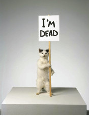 这些指示牌所指示的作品本身就与其所在地点关系密切,即便称不上真正的定点作品(因为它们与展出场地的关系并非提前确定的),也可以说从周遭环境获益匪浅。例如,Bruce Conner从上世纪七十年代以来创作的影绘系列“天使”被放在雕塑厅的阳台上,对面是一排石膏像。Conner十二幅真人大小的物影照片大理石般的色彩与对面的雕塑形成对应,昙花一现的影像似乎也带上了石头的实体感。又比如,曹斐抒情诗般的录像作品《谁的乌托邦》(2006—2007)被放在楼梯底端;David Shrigley拿着“我已经挂了”标语牌的小猫标本则被分到所谓的“财宝屋” 一个落满灰尘的玻璃橱窗;Susan Philipsz的声音装置《日落之歌》(2003)落户博物馆大院,该装置喇嘛的音量取决于太阳光的强度。以上优秀艺术作品都从周围环境汲取了不少力量。
