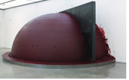 在波士顿ICA的展览上,卡普尔对作品精挑细选,以大手笔将极简主义这个怪物无言地呈现在大家面前:庞大物体徘徊在可视性的边缘上,神秘的映像被投射在我们与它们实际的表面之间的空间上,或将蜡制怪物用褐红树脂粗粗黏合。卡普尔对于原料语汇(色素语言,镂空语言,镜语言,蜡语言,他这样称呼它们)体钵继承的最新阶段,是在波士顿展出的作品《过去,现在,未来》(2006)。现场,一个球体庞大的局部雄踞于地板、墙面和天花板之间,周身涂上了好几加仑的粘忽忽的蜡和油彩;一个机械装置割开了球体,似乎要为它塑形。这个仪器的运作,每100分钟循环一次,再次证明了卡普尔内心对“自我展示”“无作者”“自我创造”“自动生产”这样的物体的热衷。当然,这种手法也是有先例的,如Jasper Johns的刮涂料的机器,Richard Serra铸造的棱角,Matthew Barney渗出的原料,甚至是Gerhard Richter的“自动主义”的抽象。也许,最有力的说明当属其与Mona Hatoum重要的自动化作品+and-,1994-2004之间的联系,后者在沙地上作画,画完就消失,从而批判了机械性“成形”过程的生硬性。卡普尔的机械主义与Hatoum对于创作者姿态的矛盾态度有异曲同工之处。如一个缓慢而巨大的陶艺塑形工具一样,《过去,未来,现在》中的机械试图塑造一个完美半圆形,但这样的任务却决不可能完成。因为墙面成为了障碍,填塞的蜡也在两边慢慢堆积。这件作品并没有Hatoum的作品那么灵敏,但依然令人印象深刻,它将物质上的混乱和技巧上规整的完美结合在一起。