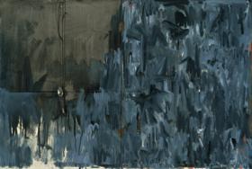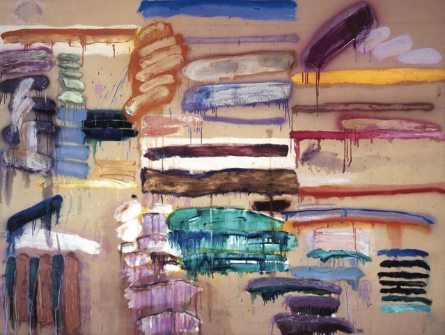行动绘画标记从表现主义遗痕里的分离催生了大量可能性,也为我们隐藏的宝库提供了一部分内容。五十年代后期发展起来的各种标记语言里,有一种特别引人注目:米切尔,托姆布雷,约翰斯,诺曼•布拉姆(Norman Bluhm)等艺术家的作品中都出现了水平扫过表面的笔画,颜料则沿着垂直方向小股小股往下淌;从那以后,这种表现方法就成为常用绘画技法之一。形式被交予其物质性里的自然重力全权处理,因此笔画也就反映出了时间的流逝。例如,与对波洛克“滴洒法”的阐释不同,向下流淌的颜料似乎并不希望建造一个永恒的现世或一个长期存在的当下。这种笔法将其自身定义为一个已经完成的姿态,一种由来已不得而知的行动痕迹。如此一来,流淌的颜料创造出一个哀婉的时间结构:对现在的理解要在过去的模式中实现。约翰斯的作品《纪念我的感觉——弗兰克•奥哈拉》(In Memory of My Feelings—Frank O’Hara,1961)名字起得恰到好处。鉴于以上论述,我们可以说,这幅画相当于一个隐喻,表现的是主题的迷失以及已经杳然远逝的认知时刻。这种哀婉的模式为绘画姿态(painterly gesture)的库存又增添了一种富有生产力的可能性;艺术家还会通过其他途径探索其符号学方面的潜质。