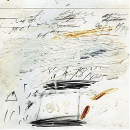 以上对行动抽象派的重新解读类似于凯奇的“不确定性”概念。1958年后,为了直接回应凯奇,约翰斯,劳申伯格,托姆布雷,就连卡普罗都醉心于创造一种符号学上的“不确定性叙述”,努力调动绘画平面并使其成为一个分散的符号陈列场所。就这方面来说,托姆布雷1958年以后的创作实践非常引人注目。他在《诗歌——致大海》(Poems to the Sea, 1959)系列画中建立起了一座象征、标志和索引符号的巨大仓库,唤醒了一份荒诞不经的记号词汇表,以及一个被各种不同联系、注释、分裂和无动于衷所围困的失控的阅读过程。富有暗示意味的标题使以上元素的力量大大增强:伽拉忒亚的凯旋(Triumph of Galatea, 与拉斐尔壁画作品同名), 弗洛拉(花神)的王国(Empire of Flora),八月节(Ferragosto)。在这些对不确定性的叙述中,不同观点和符号的同时现身将创作的行动交予观众,不断督促他(她)建立变化莫测的意指。其结果就是文本与视觉意义的闪烁,一种游走于分崩离析和想象力迸发之间的无目标运动。而在两极中间打开的空间则为互相矛盾的图案,暧昧不明的连结,彼此冲突的讽刺姿态提供了容身之所——Georges Didi-Huberman称之为绘画的“魅影”。