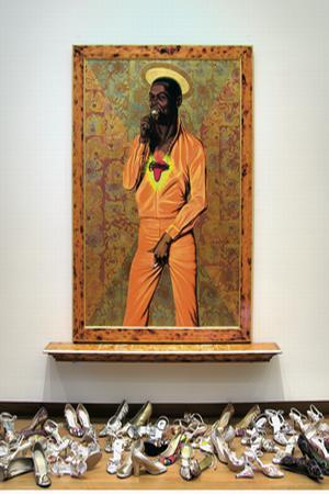 实际上,亨德里克斯作品里很多人物都来自他的日常生活:康涅狄格州新伦敦(1972年起,他一直担任康涅狄格大学艺术系教授);纽黑文(七十年代初,他曾在耶鲁读研究生);费城北城区(五六十年代他长大的地方)。最近在哈林工作室美术馆举办的亨德里克斯作品巡展“酷派的诞生”(Birth of the Cool)将所有这些画作集中到一起,为观众展开了一幅韵律和节奏都一流的人物长卷。艺术家的构图让我们看到文化他异性和地方风格的不同形式之间存在一系列对位关系。例如二楼展厅里,一名衣着泼辣的黑人妇女穿着黄色紧身裤在棕黄色背景映衬下一脸灿烂的笑,似乎在和左边浑身桔黄,一手抓住胯间的大明星费拉•库蒂(Fela Kuti)打招呼。两人中间是《北费城的黑鬼(威廉•科贝特)》(North Philly Niggah [William Corbett], 1975)的主人公,他穿着水蜜桃色的外套,舒服地站在米色背景中,警惕地望着整个场景。这些画挂得离地面很近,在明亮灯光的照射下,无论是格式还是其华丽的装饰都令人想起宗教圣像——即使画中人个个鲜活得仿佛要夺“框”而出,不仅改变我们对其身处社会环境的理解,也重构了观众所在的美术馆空间。