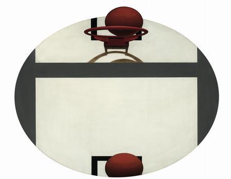 对于亨德里克斯来说,考虑这类现实就意味着在创作中与历史固有类型和人文本质反其道行之。所以,他既画具象画,也画抽象画,目的是激发一种视觉和认知体验上的多样性,用以确定并取出“黑色”的总体轮廓。例如,《Vertical Hold》(1967)里的篮球和篮板就为给“成形画布”(shaped canvas)提供一个都市解读奠定了基础,也仿佛是对弗莱德著名论断的回应。弗莱德曾说1966年左右的绘画需要抓住自身的形状以激发(观众方面的)信念。这里的形状不是建立在绘画图像的抽象几何图形之上,而是植根于一个黑色主题(black subjects)在其上纵横交错的扁平区域。那么,这件作品称得上是艺术史学家里奥•斯坦伯格(Leo Steinberg)所谓的对现代主义绘画的重新取向,是从垂直平面到水平位置的一次转移。这样的变化在不同层面上影响着我们对场所的认知——不管是《Granada》(1970)的画布篮球场,还是《Buck》(1967)的棋盘图案,两者都象征着黑人离散文化(black diasporic culture)横贯的场所。