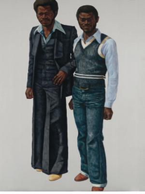 亨德里克斯对此并不陌生,他曾经去过欧洲,非洲和加勒比沿岸。正是这些旅行支撑起了他作品背后的泛非洲联系。在工作室美术馆的展厅,《APB’s(巴黎的非洲兄弟)》(APB’s [Afro-Parisian Brothers], 1978)里衣着光鲜的两名黑人男子似乎可以毫不费力地与旁边《姐妹(苏珊和托尼)》(Sisters [Susan and Toni], 1977)中漂亮迷人的女士们攀谈交流。而且同样的人物如果出现在马里克•斯蒂贝(Malick Sidibé)在巴马科(马里首都)某面水泥墙壁边上拍的照片或者桑福德•索亚(Sanford Sawyer)在拿骚(巴哈马首都)华丽的金色窗帘前捕捉的图像里也毫不奇怪。亨德里克斯作品里画中人所处的环境很像上述摄影作品的背景,只是去掉了具体的空间或建筑元素。通过这样的布景,他让我们看到了七十年代世界各地的黑人在自我视觉塑造上的差异与相似性。艺术史学家克里斯塔•汤姆逊(Krista Thompson)对当时情况的描述是黑色(blackness)好像可以“从某个特定的时间和空间被抽取出来,然后……体现到任何地方。”虽然亨德里克斯说他更喜欢画真人模特,但他的作品常常是根据照片创作的。由于画中背景往往和对象本身的颜色形成搭配,我们也许可以说这些人物仿佛是从他们所在的背景中冒出来的,就像一种反常的摄影效果,混淆了真实和虚拟。亨德里克斯的布景让人想到工作室,想到银幕,想到单色调绘画,还有被斯坦伯格称作“设计技术”(design technology)的平面排列。在此背景下,跨越国界,流散的黑人文化获得了惊人的可见度。