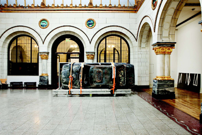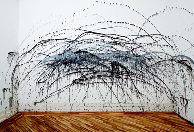 我猜我在试图描绘异常与正常之间的亲缘关系,或者说找出两者之间的互动。艺术史当然充满了各种偏向极端的创作实例,而我觉得我的作品把极端主义冲动及自由形式与对极端主义的控制和机构化两者之间的张力完全调转过来了。如果要更具体一点,你也许可以说,我的作品对各种文化交换中的景观和奇观做出了高度暧昧的回应,而在这种情况下,极端主义或艺术创作的回应往往会试图消除,否认或颠覆奇观。我对塔利班“教育雕塑”(他们没收非法录像带,把里面的磁带扯出来,缠在路边的柱子上,作为“公共雕塑”,警示百姓)的重造就是很好一例。我不断寻找非奇观的象征,特别喜欢研究这类对奇观的攻击最后如何自己也变成了某种奇观。