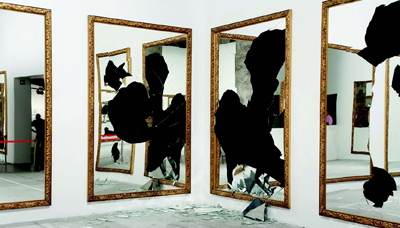 漫长的军械库之旅这才走出第一步,电影效果这条金线在紧随其后的另一件大型装置作品中得到进一步发展。帕佩幽暗的神光显现变成了米开朗基罗•皮斯特莱托(Michelangelo Pistoletto)明晃晃的情节剧。二十二面镶着古典式金色边框的大镜子围绕一间封闭的大展厅排开。其中二十面镜子已经在开幕的表演中被艺术家砸碎,玻璃残片有的挂在镜子黑色的衬底上,有的散落在地板。观众排成很窄的一队,从中间的安全地带挨个通过,整体效果更像费里尼的作品,而不是德米尔或斯皮尔伯格。这一次,这位贫穷艺术(Arte Povera)的中坚战士并没有使用该运动常见的废弃的背景,而是在军械库黑暗,看似无穷无尽的中世纪空间(宛若巨大的录影棚)中创造了一套令人难忘但相对单薄的室内布景。