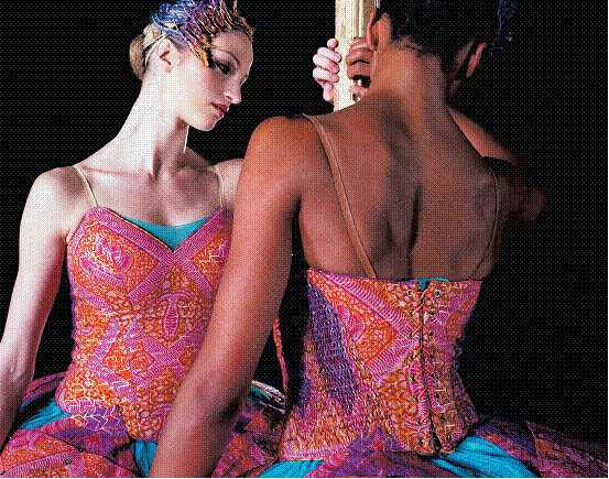 《奥戴尔和奥黛特》(Odile and Odette, 2005)是索尼贝尔的第二个录像作品,体现了近来他对精神内在的观察与探索。两名芭蕾舞者,一黑一白,身穿荷兰蜡染布做成的衣裙,彼此相互映照。当她们在镜子前跳舞或摆姿势的时候,我们可以听到她们的呼吸声。我们看到了那些不安的私密性时刻,思索地注视着彼此,咬着指甲,或者擦拭着裙子上的什么东西。当我们看到两个舞者相对起舞时,索尼贝尔让我们开始思考:究竟谁是谁的映像?以柴可夫斯基《天鹅湖》中的角色为原型,《奥戴尔和奥黛特》似乎成为作者1995年的装置《一个像你的女孩怎么才能成为一个像你的人呢》(How Does a Girl Like You Get to Be a Girl like You?)的后续,在这件作品中,三个无头的雕塑小人,身着荷兰蜡染做成的维多利亚时期的裙子,作品还被戏谑地起了这样一个有趣的名字。虽然这件老作品不在展览中,但是名字却令人怀念,它体现了索尼贝尔冒险精神中不停歇的质疑精神:对于决定身份、内外领域的文化影响的共通性的质疑。