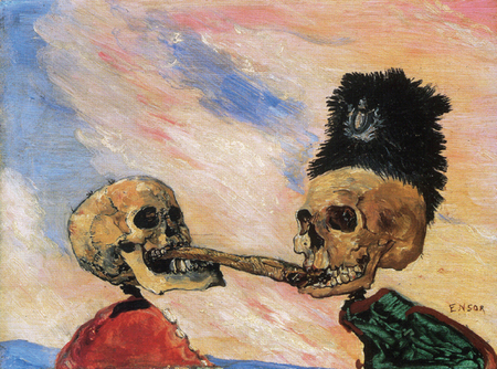 在此基础上,所有的讽刺都变成了隐喻。恩索将骷髅,面具,小丑装饰,并不是看做特别的物体,而是看成对我们的环境的比喻。骷髅是人类虚荣新空洞的象征。在恩索的手下,这一象征变成了他的虚无主义世界观的标志,通过大量的作品一而再再而三地重复着。而这本身就是一个荒谬的过程。假设你看到一群圣诞老人向你走来,他们会贬低某个给予者甚至是耶稣的礼物,吹嘘自己的华而不实。同样,一些骷髅则抵消了恩索设置的龌龊。