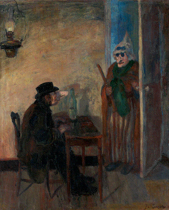 恩索最开始接受的是正规的训练,专为上流社会画室内画。除了具有亮泽的静物画和海景画外,他的描绘喝茶时间的画,由画刀一层层涂抹的画面,灰暗模糊,与上层社会的文雅有礼颇不相符。棕色的颜料外层好似掩盖了那些无法被呈现的多变情节。在1883年的一幅画中,一扇门打开,进来一位矮小的老妇,戴着盲人墨镜。她的脸上戴着面罩儿,鼻子长长的,就如在桌边迎接她的那位普通人的面具一样。从这件名为《吃惊的面具》的画开始,人们开始注意到了恩索画中给人们产生出的幻想曲。
