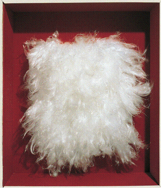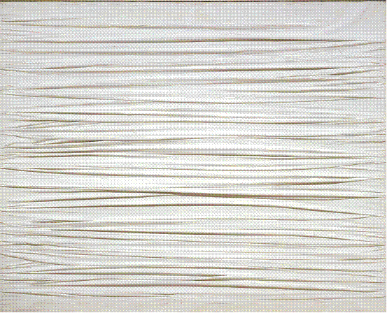 曼佐尼将色彩、姿态和构图从绘画中消解,就如艾特盖特(Atget)将气氛从他的照片中剥离掉一样,好似沃特•本杰明(Walter Benjamin)所说的无水的沉船一样。在无休止的变换中,起初,曼佐尼以有系统的折叠法来构建他的画。接着,他将简单派的单色画抽象和现成的材料结合在一起,在画上覆盖上稻草或面包卷,都浸泡在瓷土中。最终,艺术家甚至将技术上的残余抛掷脑后,转向了纯白聚乙烯泡泡,棉球堆或聚酯纤维的堆砌,将现代主义箴言放诸于材料中。