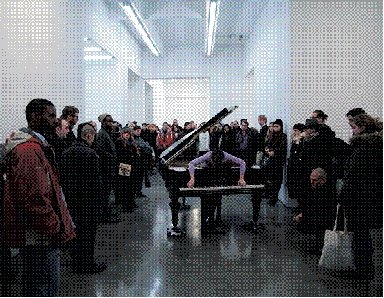 贝多芬第九交响曲第四乐章里的《欢乐颂》(Ode to Joy)不仅与浪漫的民族主义和纳粹主义紧密相关,同当代政治也有重要联系。(欧盟盟歌就是它。)在Allora & Calzadilla的作品《停下,修葺,准备:在一架预制钢琴上的“欢乐颂”变奏》中,六名钢琴师轮流反复弹奏这首名曲。琴身中间被挖了一个洞,钢琴师就站在这个洞里,因此他们是背向琴键的。钢琴脚上还装有滚轮;每位音乐家在弹奏的时候可以推着钢琴在展厅到处走。这是艺术家2008年为慕尼黑美术馆创作的作品,由Julienne Lorz策划(我看到它是2009年年初在纽约)。作品探讨了艺术与权力之间的紧张关系。《欢乐颂》的磅礴气势到了这儿不复存在,因为改造过程中切掉了两根弦,所以整首曲子少了两个八度。