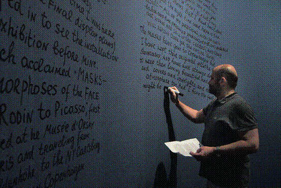 索拉科夫在“(不带面具的)情感”展览上以“罢工”的形式反对了过度视觉化的景观和拿无形劳动做交易的行为。达姆城是他个人回顾展的第三站,这一次,(据他画在墙上的漫画叙述)索拉科夫觉得自己已经筋疲力尽,不想按照策展人Ralf Beil用模型规划好的详细布局布展。相反,他把运送作品的箱子原封不动地放在画廊展厅,在旁边配上幽默的小草图。这种诗意的姿态似乎回过头纠缠着该空间上一个展览残余的展示体系(“面具:从罗丹到毕加索的面孔变形记”)。和录事巴比托(Bartleby the Scrivener,梅尔维尔小说里的人物)一样,索拉科夫不给任何借口——他就是不愿意。
