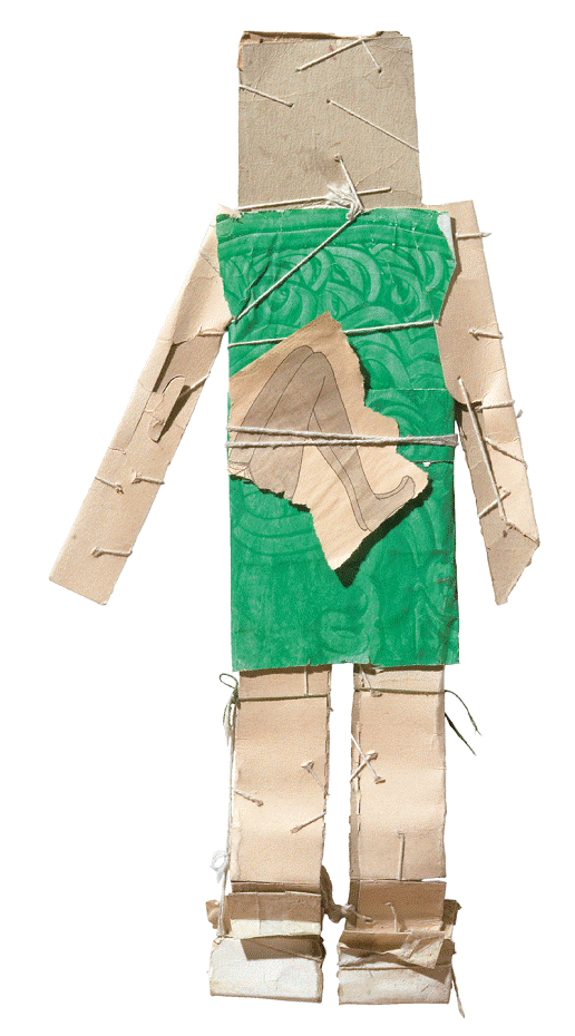 詹姆斯•卡索、《无题(穿绿裙子、腿部为打印纸的女孩)》硬纸板、纸张、仿羊皮纸、新闻用纸、水彩、53×27cm。