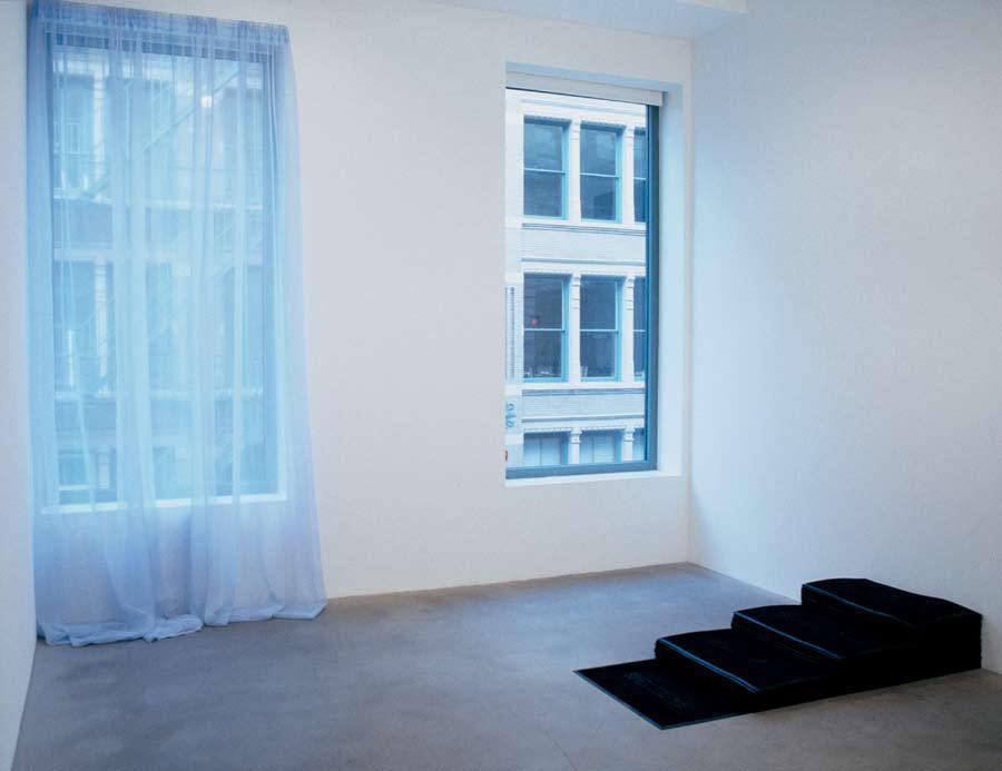 在冈萨雷斯-托雷斯的早期展览上,生产和分配的界线还不那么明显,那时候的雕塑作品散发出一种悲切、低成本、饕宴式的气氛。不管这种氛围是谢里登广场上广告牌周围的天空,还是一位男性舞者两腿之间的空间,当看见作品在为私密时刻赋值的同时也让贵重物品陷入危险,我们当中许多人都会觉得激动不已。这就是我们在取走白纸,吃掉糖果,在灯光下翩翩起舞时用自身行动加以肯定的东西。比如,在1993年巴黎 Jennifer Flay画廊的展览上,艺术家用灯光在地面划出一小块亲密区域,如果看展时你旁边刚好有人,而这个人又不介意和你跳上一曲,那么这块区域就会变得更加亲密。旁边放着一对耳机,音乐已经响起,不过只有跳舞的两个人才能听见。在《无题(舞台)》(1993)里,我们可以选择参与的程度,却无法选择是否参与,因为是否参与的选择权在我们进入展厅的那一刻就已经交出去了,我们早就处在作品的管辖范围之内。简单地说,《无题(舞台)》就像一个陷阱,它只在你屈从于控制之后才向你提供避难所。
