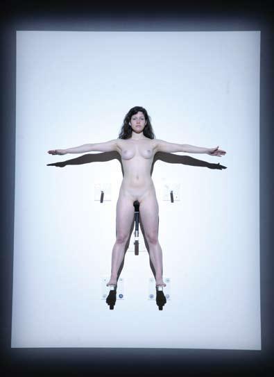 从《释放声音》到《有骷髅的裸体》(Nude with Skeleton,2002/2005:她斜躺着,将一幅骨骼放在身上,让其随着呼吸轻轻浮动)。阿布拉莫维奇往往采用“为电影而作的行为表演”和“为录像而作的行为表演”相结合的方式。这样就挑战了录像即图像,行为即现场的观念。这也提供了一种有别于本质主义模式的“行为艺术”,因为在过去的十年中,她始终在探讨重新表演这个概念。很明显,在这次回顾展上的重新表演都被“镶嵌”或“装”了起来:站在过道里、台子上,或骑在自行车座上被“钉”在墙上的裸体,还有穿衣的行为表演都在一个封闭的场地中进行。另外,位于博物馆中央的这个带有聚光灯的“盒子”也是特意为这次行为设计的。