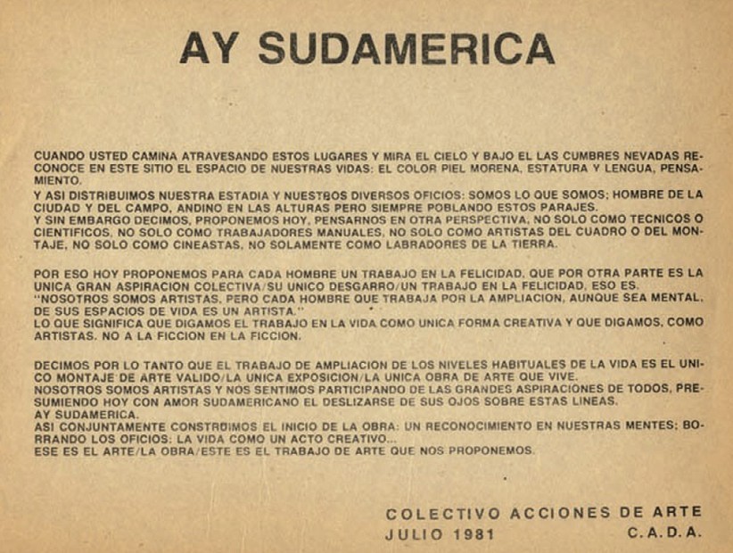 或者至少是今天在其他任何地方都找不到的知识。纵观整场展览,几十年前的作品记录与当代创作之间形成历史性对比,激发观众去思考艺术的重新分类如何呼应并反映社会的重新整合。双年展开场部分是与智力艺术团体“艺术行动小组”(Colectivo Acciones de Arte)有关的摄影、录像和海报,该团体成立于1973年智利军事政变以后,他们的主要创作行为是对城市基础设施进行半超现实的介入,比如:让十辆牛奶车在圣保罗街头绕行(以抗议政府终止为穷人提供食物补助),或者让五架赛纳斯飞机从空中向城里散发传单,号召市民把日常生活的安排当成一种“创意行为”来看,和做艺术一个道理。(其中有一句话最能表现他们认为艺术并不占据任何高地:“没有虚构在虚构中产生。”)在由奥斯卡•尼迈耶设计的宏伟建筑中继续往前走,接下来看到的文献材料与阿根廷“前卫艺术家团体”1968年组织的“首届前卫艺术双年展”有关(当时开幕混乱场面的照片曾在第十二届卡塞尔文献展上展出),该团体六十年代曾经深入图库曼地区的庄园创作,1968年展览上的作品就是这段时期的创作成果,而当时图库曼地区的人民因为独裁者胡安-卡洛斯-翁加尼亚的私有化政策正饱受失业之苦。