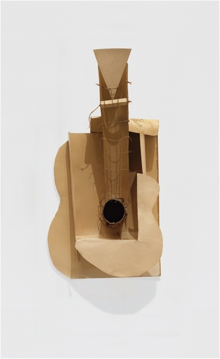 巴勃罗•毕加索,《吉他》,1912,硬纸板、纸、弦、上色的金属线,64x33x19cm。