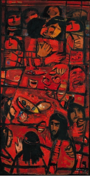 塞尔维亚艺术家Fateh al-Moudarres1965年画下了自己演绎的版本《最后的晚餐》(The Last Supper),画面上杯盘狼藉,这些布道者、宗教偶像毫无神圣之态。几十年过去,在多哈新开放的Mathaf: 阿拉伯现代艺术博物馆里,公众们首次看到了这件作品,它将近六英尺高,由油画颜料、沙子、蜡做成,画中的基督徒沉沦于杯中之物与勾心斗角。这幅画的购买者,是大马士革美国使馆的文化专员,这幅画尺寸的笨重,意义晦涩,但此人还是破不期待地将其搬回了家里。al- Moudarres(1922-1999)在此将救世主耶稣的生命循环作为一个反抗殖民争取自由的现代阿拉伯故事进行描述。如果说阿拉伯的当代艺术创作在过去十年里,已经开始进入了批评领域,那些重要的鼻祖比如al-Moudarres,几乎依然被完全忽略。他们的遗产主要是以交口相传的方式传播,偶尔人们看到类似的作品时,会暂时想起它们。