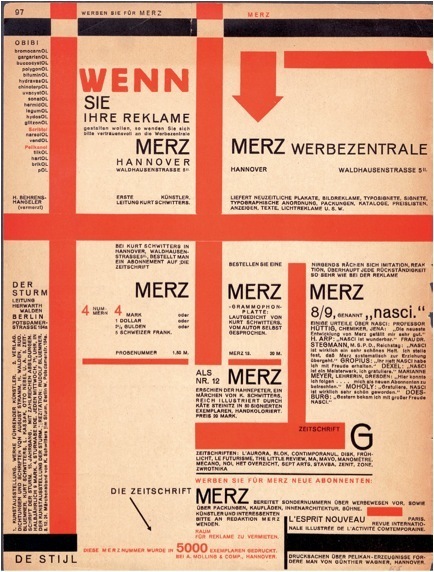 在整个1920年代,施维特斯本人也一直处于不断辗转中,他与各种各样的人物旅行和合作,这其中有赫尔瓦特•瓦尔登(Herwarth Walden)、埃尔•利西茨基(El Lissitzky)、拉乌尔•豪森曼(Raoul Hausmann)和凡•杜斯堡(Theo van Doesburg)——并且,他和这些人的联系还说明他的艺术创作游移于表现主义、达达和构成主义之间。汉诺威地处边缘,以中产阶级财产的堡垒而著称,它不仅是施维特斯的艺术源泉,也为其提供了材料:由于居住在这一边缘城市,他强烈感觉到自己不能不与欧洲的前卫艺术进行合作和联系,即使他将汉诺威作为他文章里的主角,他完成了市政建筑的设计工作,并且明白他自己的名誉是与这座城市息息相关的(这里必须要说的是,在汉诺威,还有一些人和机构——例如博物馆馆长Alexander Dorner和新建的具有前瞻性的当代艺术展览空间Kestnergesellschaft——构成了一个比较小但是很活跃的前卫艺术圈子)。有了词汇、风格和拼贴用的材料,施维特斯将中心与边缘之间的联系——或者更确切的说,他将形成这些联系的文化观点与实践——作为他的基本素材。