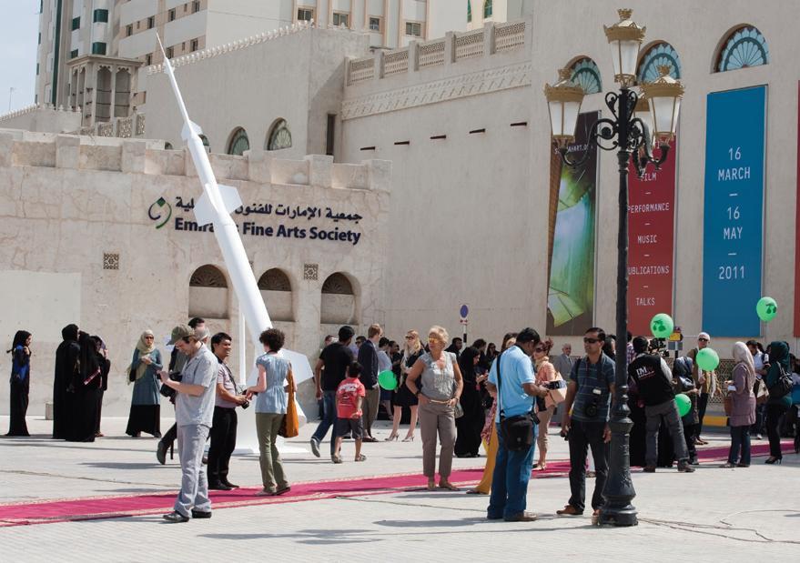 沙迦双年展入口。Joana Hadjithomas与Khalil Joreige,《黎巴嫩火箭协会:纪念碑的元素》,2011,第十届沙迦双年展开幕,阿联酋,2011年3月16日。