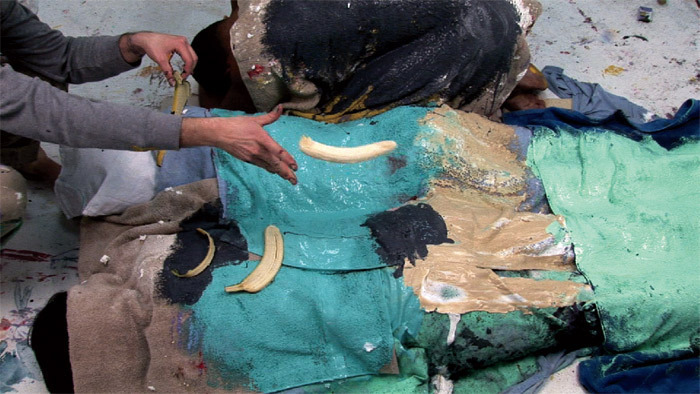 去年,当我看到莱迪•丘奇曼(Leidy Churchman)的录像时,我觉得我现在死了也可以放心了;我想传达给世界的讯息已经传达到了,行动绘画已经找到合适的继承人。在去年参加MoMA PS1“大纽约”群展的“绘画治疗”作品中,丘奇曼和她的搭档安娜•罗森(Anna Rosen)在朋友们的身体上进行了即兴的绘画创作,以“水疗”这种最常见的身体理疗形式来展现肉体的愉悦。哪怕是批评理论家也喜欢按摩捏脚,不是吗?我们这些应邀参加丘奇曼录像拍摄的人进门以后被要求脱衣服,盖上毛巾躺下,然后丘奇曼和罗森便开始忙碌起来。当两人工作时,俯卧的我们状态越来越放松,懒洋洋的感觉仿佛正在做真正的水疗一样,脑子一片空白。与此同时,一旁的摄像机记录了整个过程。她们在我们身上开起了颜料铺,有时候把一根蘸满淡紫色颜料的香蕉揉到我们的屁股上,有时候拿一根滴着绿色和棕色颜料的耙子在我们腿上刮来刮去,有时候让铬黄色瓷漆任意滴到我们背上,或者喷撒一些灰绿色的粉末。